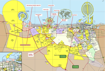 Map showing the numerous infrastructure projects that are built into the sea in Dubai.